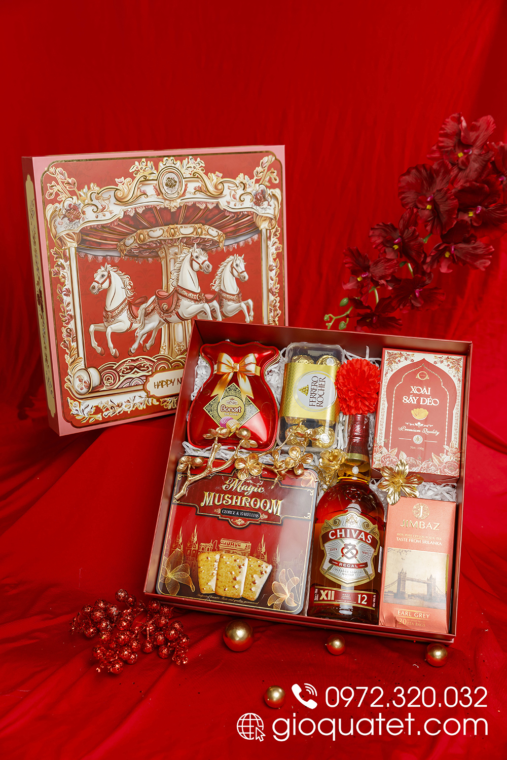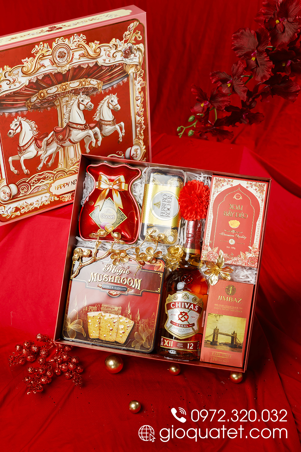 H604 nổi bật với Rượu Chivas Regal 12 – biểu trưng của sự thành công và đẳng cấp, kết hợp cùng trà túi lọc Jimbaz nhập khẩu Sri Lanka và socola Rocher nhập khẩu Mỹ. Bánh quy bơ hạt Mushroom và kẹo trái cây nhập khẩu bổ sung sự hài hòa về hương vị, trong khi xoài sấy dẻo tạo điểm cân bằng tinh tế. Tổng thể giúp hộp quà thể hiện rõ sự trân trọng, chuyên nghiệp và thiện chí trong quan hệ hợp tác.